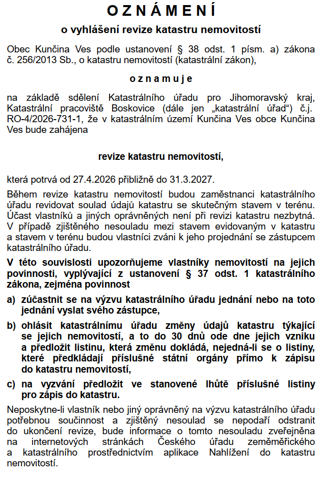 Publikováno 9. 3. 202615. 3. 2026 Od kuncinavesOznámení o vyhlášení revize katastru nemovitostí 2026-03-09-Revize-katastr.pdf Vyvěšeno: 09. 03. 2026 Sňato: